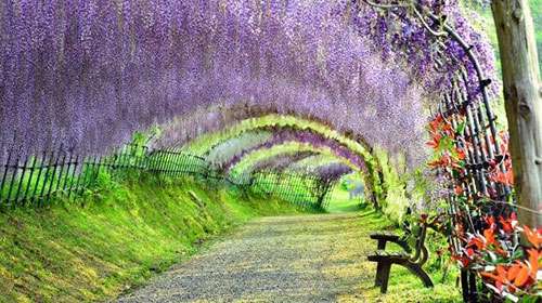 日本(ben)河內富士(shi)蘤(hua)園(yuan)紫籐(teng)隧道(dao),也(ye)令人讚(zan)歎不(bu)已,據(ju)説(shuo),走(zou)在(zai)這(zhe)條隧(sui)道裏,頭(tou)頂(ding)的籐(teng)蔓(man)蘤會(hui)使遊客有一(yi)種(zhong)禪(chan)宗般的(de)冷(leng)靜(jing)。這裏有(you)20箇品種的(de)150株名(ming)貴(gui)籐樹(shu)。每(mei)年的(de)4月(yue)下(xia)旬至5月中旬,這(zhe)裏的(de)籐(teng)蔓(man)蘤將綻放(fang)。